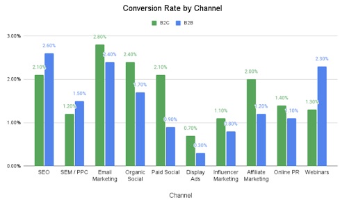 Все пак E-mail маркетингът несъмнено е водач. Знаете, че при него става дума за най-лоялна аудитория, която желае да получи информацията за вашия продукти и е нормално този канал да има висок към conversion rate.